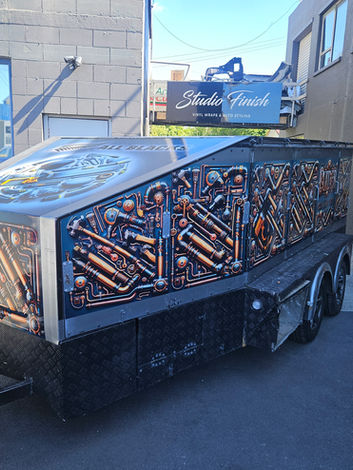 We completed a full printed vinyl wrap for a custom-built steel trades trailer owned by Rata Builders — a distinctive project with a highly stylised steampunk artwork theme.